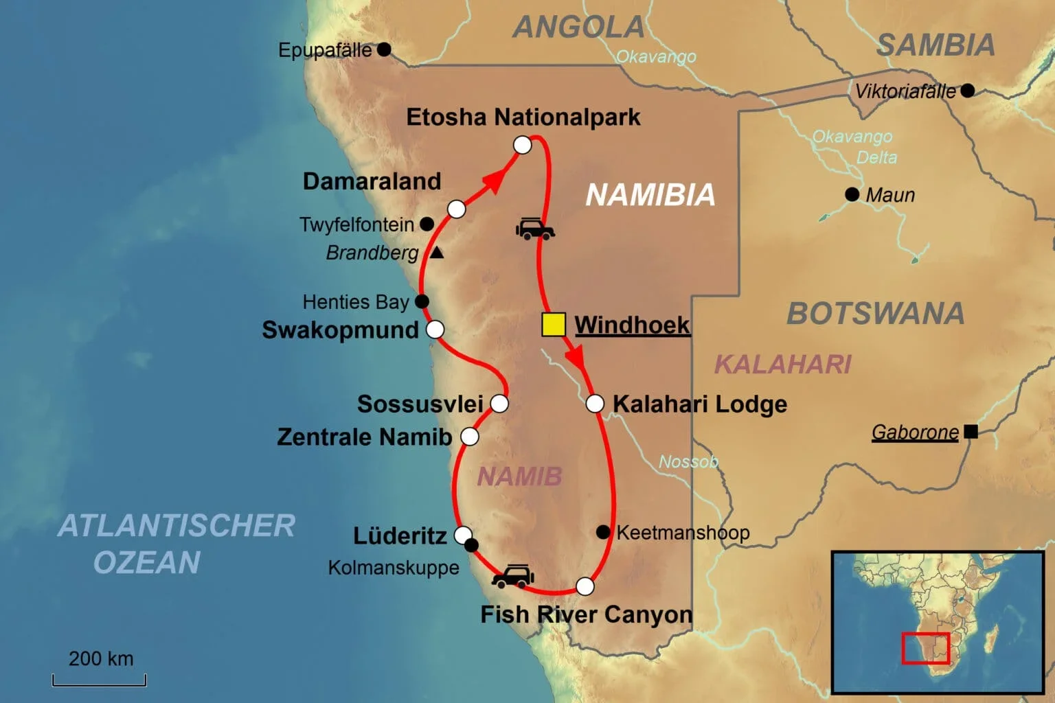 Ulike turmuligheter innen reise afrika namibia, inkludert 4×4-eventyr eller mer avslappet utforskning, kan tilpasses til din smak og preferanser.