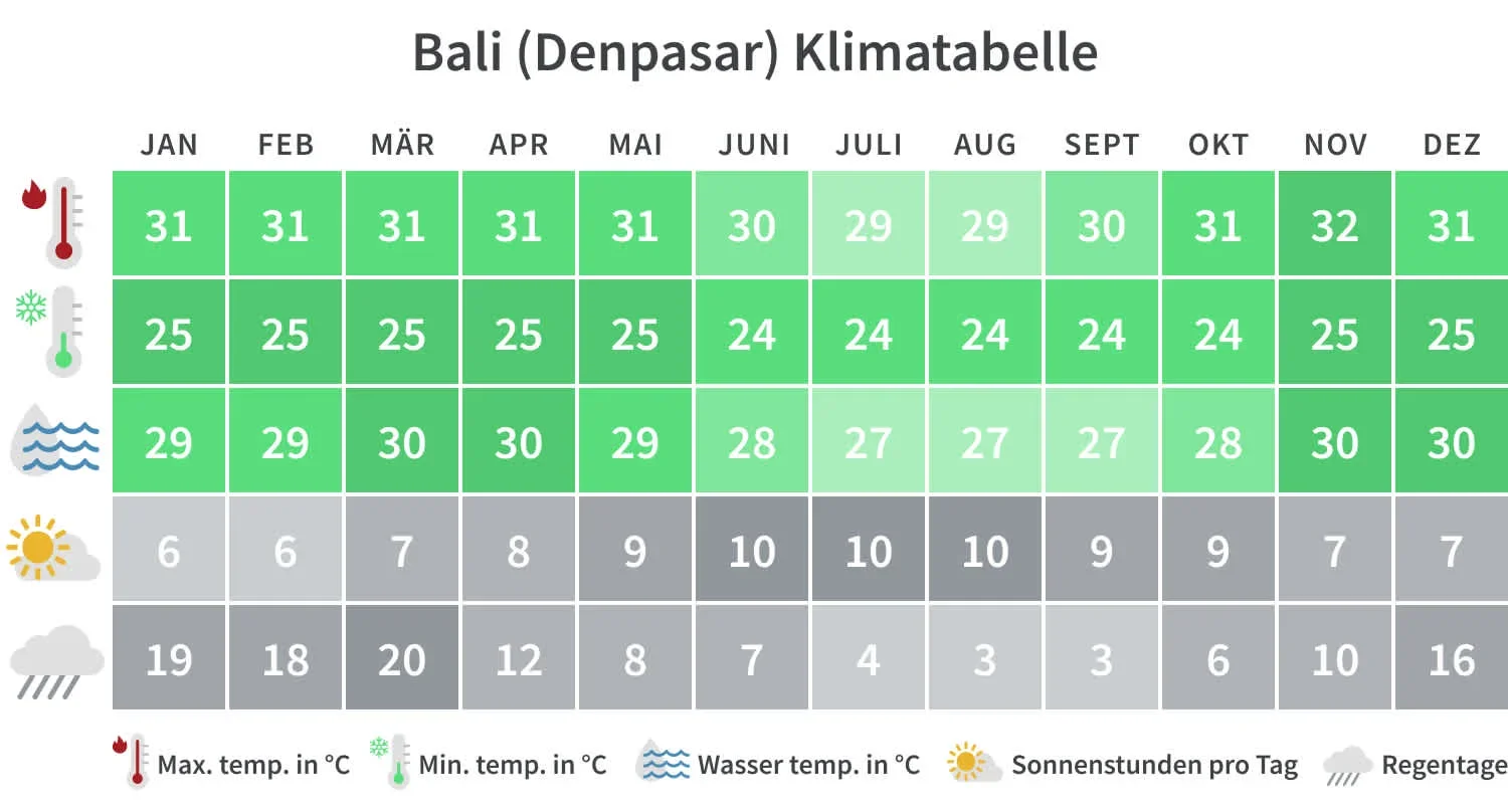 De besøkende kan glede seg over lange dager med sol og minimal regn, noe som maksimerer mulighetene for å utforske de fascinerende områdene på Bali.