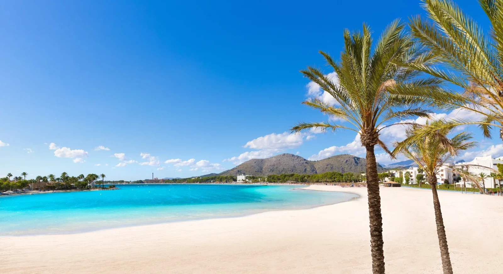 Stranden i Alcudia er kjent for sitt fine, hvite sand og det klare, turkise vannet, noe som gjør den til et perfekt sted for både bading og soling.